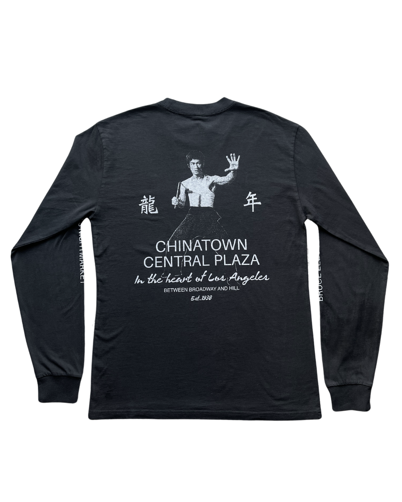 Celebrate the essence of martial arts legend Bruce Lee and the spirit of the historic Chinatown Central Plaza with our exclusive Bruce Lee long sleeve tee, created in collaboration with the Bruce Lee Foundation. Features wide neck ribbing with twin stitching, cuffed sleeves, side seamed, shoulder to shoulder tape, double needle hems, garment dyed, preshrunk to minimize shrinkage.